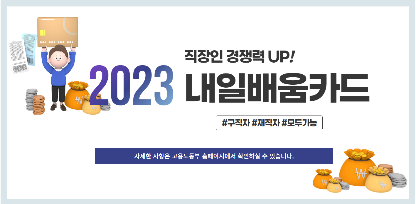 매 년 반복되는 생활과 함께 열심히 직장을 다니고는 있으나 언젠가는 관둬야 한다는 불안한 현실에 뭔가를 배워보고 싶다는 생각으로 용기내어 도전해보지만 비용이 다소 부담스러웠던 분들에게는 희소식입니다.정부에서 국민 내일배움카드라는 경제적 지원제도가 있어서 조금 늦은감은 있지만 여러분들에게 소개해 드리려고 합니다. 내일배움카드는 고용노동부에서 취업 준비생, 재직자, 실업자를 대상으로 직업능력개발훈련을 지원하기 위해 발급하는 카드입니다. 내일배움카드를 발급받으면, 훈련비의 일부 또는 전액을 지원받을 수 있습니다.