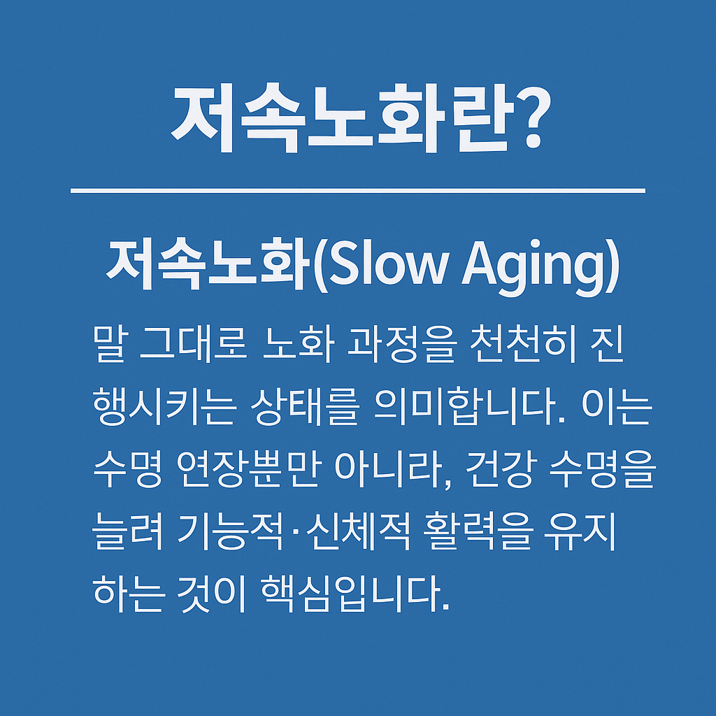 저속노화(Slow Aging)는 말 그대로 노화 과정을 천천히 진행시키는 상태를 의미합니다. 이는 수명 연장뿐만 아니라, 건강 수명을 늘려 기능적·신체적 활력을 유지하는 것이 핵심입니다.