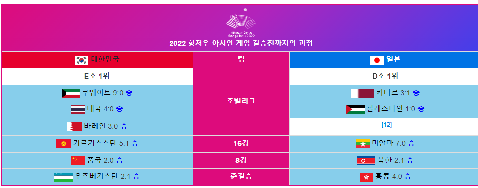 한국과 일본 두 팀은 모두 아시안게임 남자 축구에서 강호로, 역대 아시안게임 남자 축구 결승전에서 10번 맞붙어 5승 5패로 팽팽한 승부를 펼쳐왔습니다.이번 대회에서 한국과 일본은 각각 우즈베키스탄과 홍콩을 꺾고 결승전에 진출하게 됐습니다.