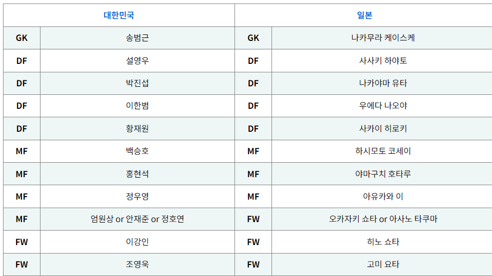 한국과 일본은 준결승전에서 승리한 라인업을 결승전을 앞두고 크게 바꾸지 않을 것으로 보입니다. 하지만 현재 한국은 엄원상이 우즈베키스탄과의 경기에서 부상을 입어 결승전 출전이 불투명한 상황입니다. 만약 엄원상이 결장한다면 안재준(부천)이나 정호연(광주)이 엄원상의 자리를 대체할 가능성이 있을 것 같습니다.