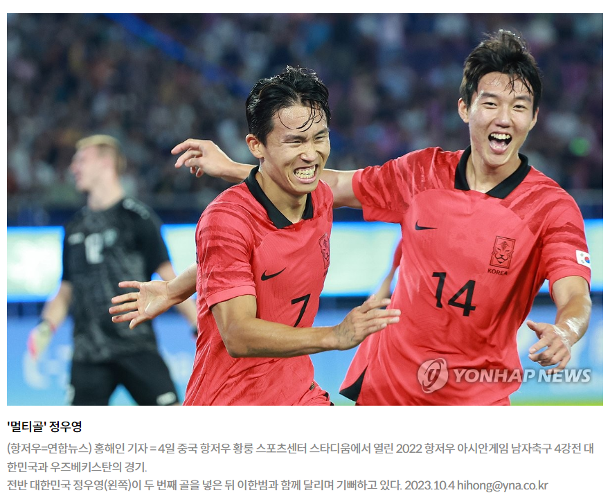 한국은 4일 중국 항저우 황룽 스포츠센터 스타디움에서 열린 준결승전에서 정우영(슈투트가르트)의 멀티 골에 힘입어 우즈베키스탄을 2-1로 물리쳤습니다. 정우영은 이번 대회에서 7골을 넣으며 득점 단독 선두 자리를 이어가고 있습니다.