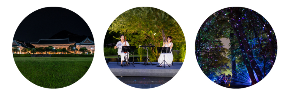- 아늑한 숲 소정원, 도심의 야경을 그대로 느낄 수 있는 관저길 웅장한 반송 옆 녹지원의 숲길은 밤이 되면 낮의 소음을 덜어내고 아름다운 별빛을 머금은 공간으로 재탄생 하게 됩니다. 잔잔한 공연과 별빛 조명까지 밤의 청와대에서 일상 속 여유를 되찾아보시길 바랍니다.