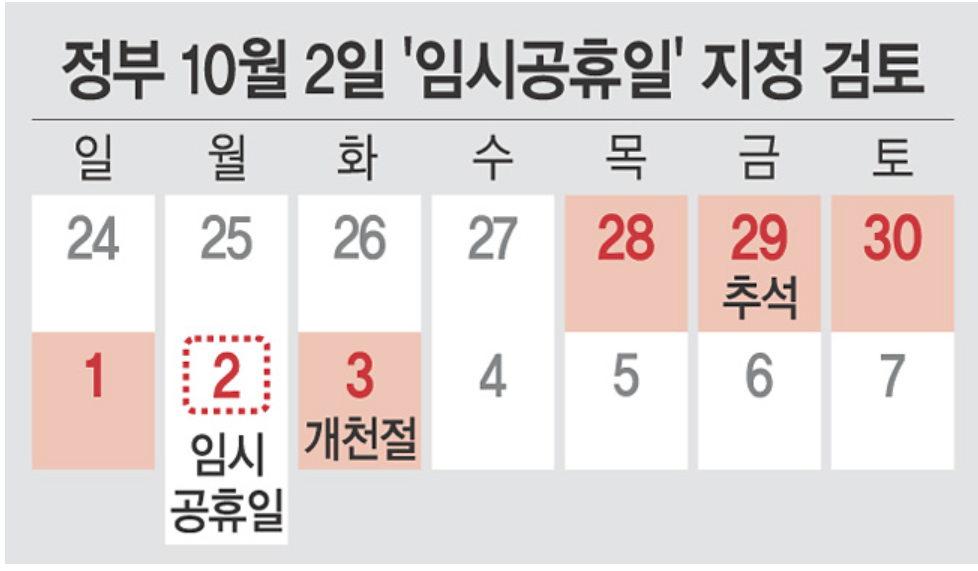 - 현재 정부도 임시 공휴일을 추진하려고 논의 중에 있습니다. 10월3일은 개천절 공휴일이라, 10월2일 월요일에 연차를 내면 총 6일 동안 쉴 수 있게됩니다. 여기에 10월 4일부터 10월7일까지 사흘간 연차를 추가로 내면 10월9일 한글날까지 최장 12일을 쉴 수 있어 장거리 여행 또한 부담없이 가능해집니다.