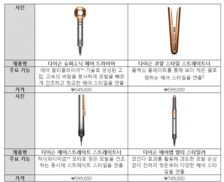 - 올 해 다이슨은 네 번째 헤어 케어 제품으로 에어스트레이트 스트레이너를 출시하며 혁신적인 제품 라인업을 다시 한번 확장했습니다. 다이슨은 2016년 슈퍼소닉 헤어 드라이어를 출시하며 헤어 케어 시장에 진출했으며, 2018년에는 다이슨 에어랩 스타일러, 2020년에는 적은 열로 원하는 스타일링할 수 있는 다이슨 코랄 스타일 스트레이트너를 출시했습니다. 2023년 처음으로 젖은 모발 건조와 스트레이트 스타일러 기능이 함께 탑재돼있는 다이슨 에어스트레이트 스트레이트너를 출시하였습니다.
