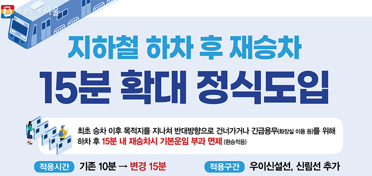 서울시는 2023년 10월 7일부터 지하철 하차 후 재승차 제도의 적용시간을 기존 10분에서 15분으로 연장하고, 적용구간을 기존 1~8호선 및 9호선에서 우이신설선과 신림선으로 확대한다고 밝혔습니다. 지하철 하차 후 재승차 제도는 지하철을 하차한 후 동일역에서 10분 이내에 재승차할 경우 환승을 1회 적용하는 제도입니다. 이번 조치는 시민의 편의를 높이고, 대중교통 이용을 활성화하기 위한 것으로, 연간 약 1,500만명의 시민이 혜택을 받을 것으로 예상됩니다.