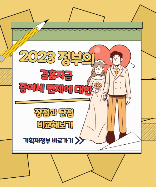 - 이번에 기획재정부가 발표한 2023년 세법개정안에 따르면 혼인신고 앞/뒤로 2년, 총 4년 동안에는 1억 5천만 원까지 증여해도 세금을 물지 않도록 한다는 발표가 있었습니다. 이는 부부 한쌍이 양가로 부터 최대 3억 원까지 비과세로 받을 수 있다는 뜻 입니다. 기존과 비교하면 부부가 3억 원을 부모로부터 받았을 때보다 약 1,940만 원을 아낄 수 있다고 합니다. 물론 재혼도 똑같이 인정한다고 발표했습니다. 기획재정부는 만약 결혼을 반복해 제도를 악용하면, 혜택을 없애는 건 물론 추가로 세금을 물리겠다고 합니다. 다만, 부모로부터 물려받은 재산을 어디에 쓸지는 특별히 제한을 두지 않기로 했습니다. 다들 사정이 제각각인 만큼 용도에 제한을 둘 경우 혜택을 받지 못하는 부부가 생길 수 있기 때문이라고 합니다. 정부는 세법개정안을 9월 정기국회에 제출할 계획이며, 국회를 통과할 경우 내년 1월부터 바로 적용이 가능할 것으로 예상됩니다. 지난해 혼인신고를 한 사람도 내년안에 증여를 부모로부터 증여를 받게 될 경우 증여세 면제 혜택을 받을 수 있습니다.