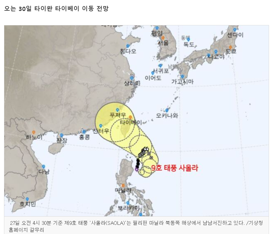 기상청에 따르면 27일 오전 4시 30분 기준 제9호 태풍 사올라는 필리핀 마닐라 북동쪽 약 360km 부근 해상에서 중심기압 945hPa, 최대풍속 초속 46m(시속 160km) 강도 '매우 강'으로 남남서진하고 있다고 합니다. 사올라는 오는 29일까지 마닐라 해상을 한 바퀴 회전할 것으로 보이며, 이어 30일 오전 3시경 중심기압 920hPa, 최대풍속 초속 53m(시속 191㎞), 강풍반경 시속 310km의 매우 강한 세력으로 타이완 타이베이 남남동쪽 약 520km 부근 해상까지 이동할 것으로 전망됩니다.