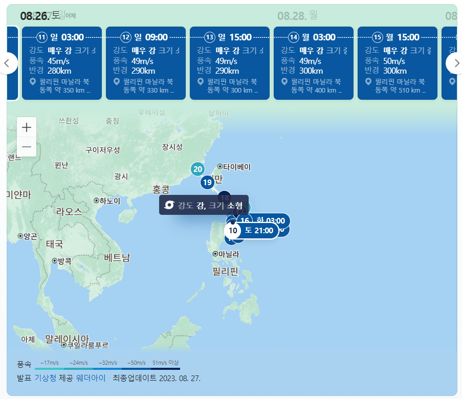 2023년 8월 24일 오후 3시경 필리핀 북동쪽 약 740km 부근 해상에서 발생한 태풍으로, 제9호 태풍 '사올라(SAOLA)'가 강한 세력으로 마닐라 해상을 맴돌고 있는 중 입니다. '사올라'는 오는 29일까지 마닐라 해상을 한바퀴 회전한 후 30일께 중심기압 920hPa, 최대풍속 초속 53m/s(시속 191km/h)로 매우 강한 세력을 유지한 채 타이완 타이베이 남남동쪽 약 480km 부근 해상까지 진출할 것으로 보입니다. 이후 티베트고기압 가장자리를 타고 들어오는 고온건조한 공기와 만날 경우 진로에 영향을 받을 수 있겠습니다.