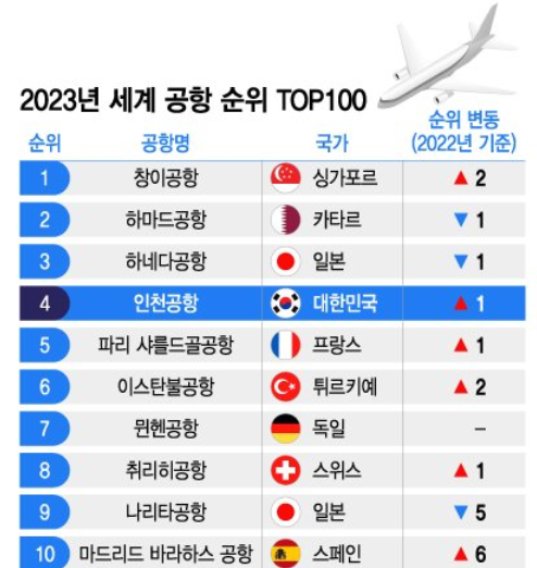 인천국제공항은 세계적인 공항 서비스 평가기관인 스카이트랙스(Skytrax)가 발표한 2023년 세계 공항 순위에서 4위를 차지했습니다. 이는 2018년 2위를 기록한 이후 가장 높은 순위입니다. 인천국제공항은 2022년에는 5위, 2021년에는 6위를 기록했습니다.