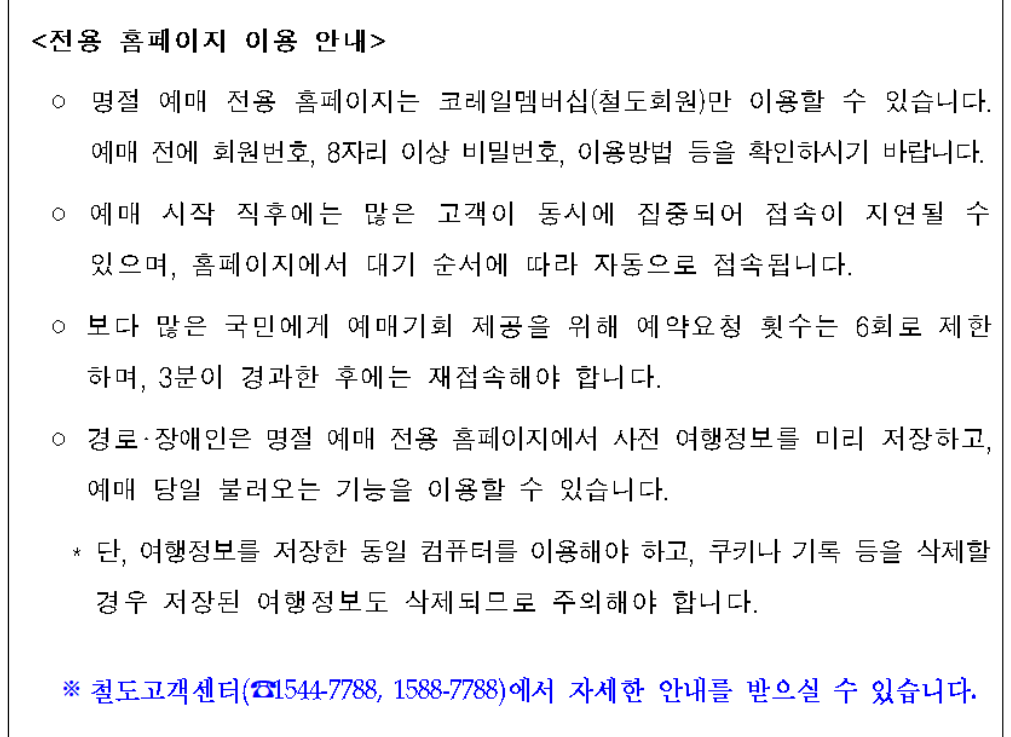 - 이번 추석 승차권 예매는 1인당 최대 예약 요청은 6회 / 시간은 3분 이내로 제한을 두고있으니 예약전 신중하게 결정하신 후 완료하시기 바랍니다.