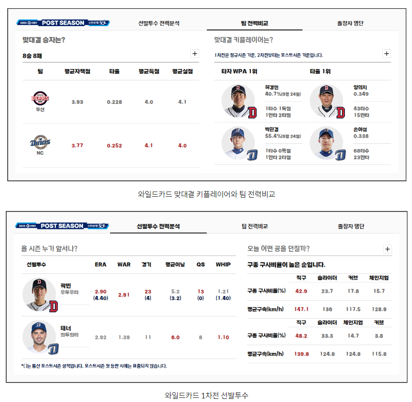 이번 경기의 선발 투수로는 NC의 태너와 두산의 곽빈이 와일드카드 1차전에서 맞붙게 됩니다. NC의 태너는 올시즌 총 7경기 중 3승 1패, 평균자책점 2.81로 강했고 두산전에는 한 경기에 등판해 1승, 평균자책점 1.50을 기록했습니다. 두산의 곽빈은 올시즌 NC를 상대로 3경기에 등판해 1패, 평균자책점 3.07을 기록했고 NC 파크에서는 한 경기에 나서 4이닝 1실점을 기록했습니다.