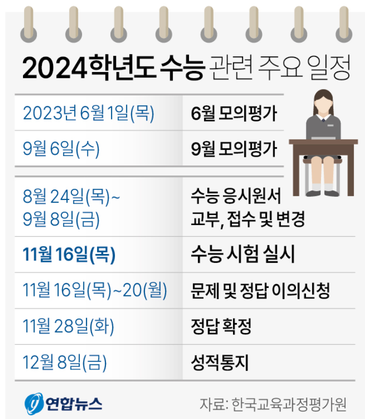 2024년 대학수학능력시험이 얼마 남지 않았습니다. 2024년도 수능점수 날짜와 수능 시험일을 잘 확인하셔서 힘들게 공부하신 만큼 수능 당일 모두 보상 받으시기 바랍니다.