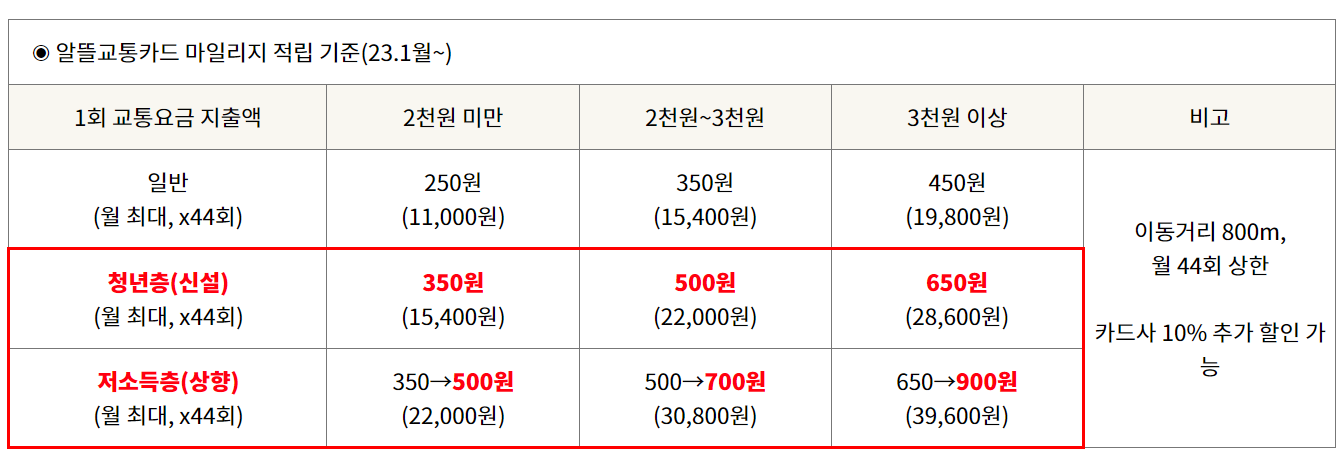 - 교통비 절감을 위한 추가 혜택 강화 : 마일리지 제도를 다양한 정책, 제도 및 민간 기업 등과 연계하여 30퍼센트+α의 추가 혜택이 가능