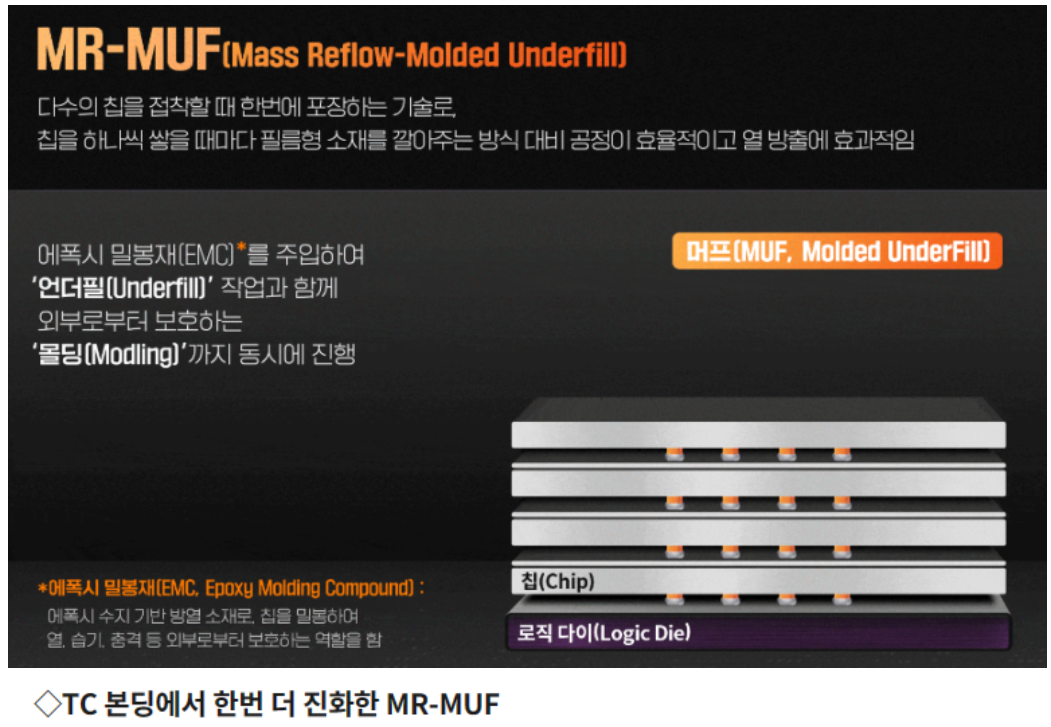 SK하이닉스는 그동안 3세대(HBM2E)부터 MR-MUF 기술을 적용해왔는데, 4세대부터는 이를 더 개선한 '어드밴스드' 공정을 HBM 생산에 활용하고 있습니다. 최신 기술을 적용해 제품의 열 방출 성능을 기존보다 10% 향상했으며, MR-MUF는 반도체 칩을 쌓아 올린 뒤 회로를 보호하기 위해 칩과 칩 사이 액체 형태의 보호제를 주입하고 굳히는 공정이라고 보면 됩니다. 기존 공정보다 효율적이고 열 방출에도 굉장히 효과적입니다.