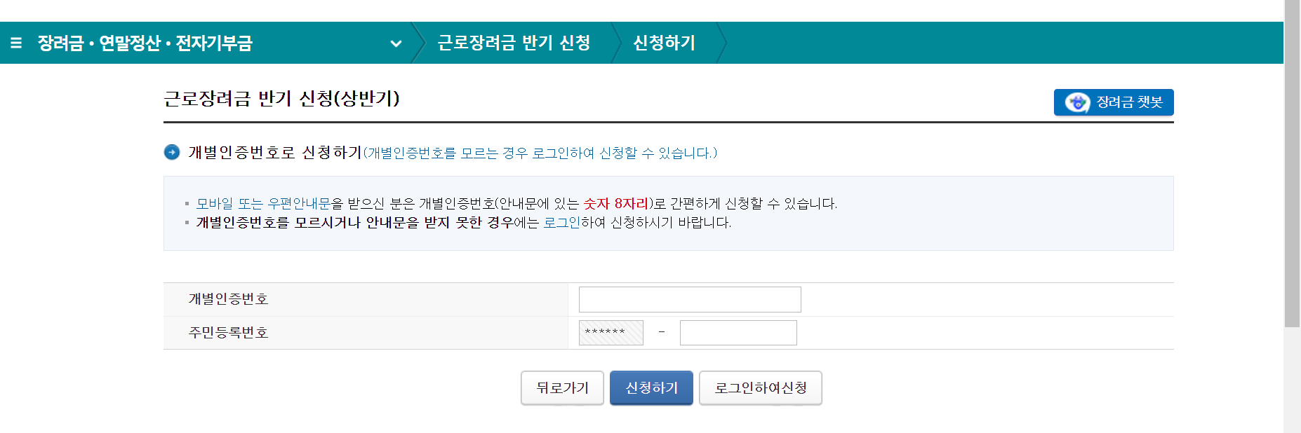 -단, 상반기 신청으로 반기 신청을 진행하셨다면 장려금 신청액의 35%를 지급한 뒤, 6월에 최종 지급액과 비교하여 최종 정산을 받게 됩니다. 이는 반기 신청을 한다고 50%를 전부 받는것이 아니니 참고하시면 됩니다. 또한 세부적은 지급액은 개인의 상황과 재산의 정도에 따라 정해지게됩니다. 만약 본인의 장려금에 대한 확인이 필요하다면 아래 링크로 이동하신 후 계산하시기 바랍니다.