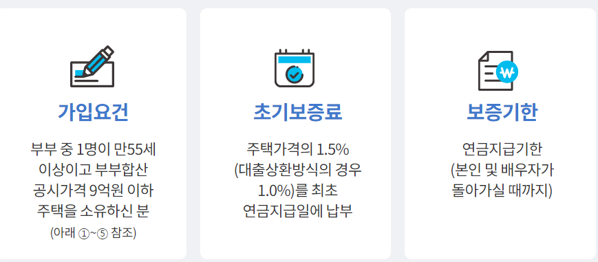 2. 주택보유수 : 부부기준 공시가격 등이 9억원 이하 주택소유자 (다주택자라도 합산 가격이 9억이하면 가입 가능, 공시가격 등이 9억원 초과 2주택자는 3년이내 1주택 처분 시 가입 가능)라면 가입이 가능합니다.