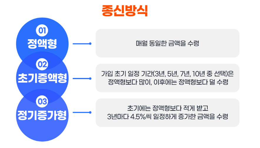 - 평생 동안 매월 연금방식으로 수령하는 종신방식과 일정기간 동안 받는 확정기간혼합방식이 있습니다. 이용 중 의료비 등 필요 시 목돈을 수시로 찾아 쓰는 개별인출제도를 활용할 수 있습니다.