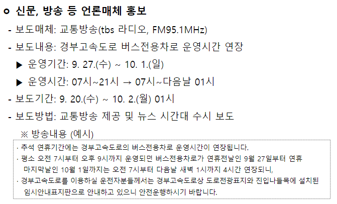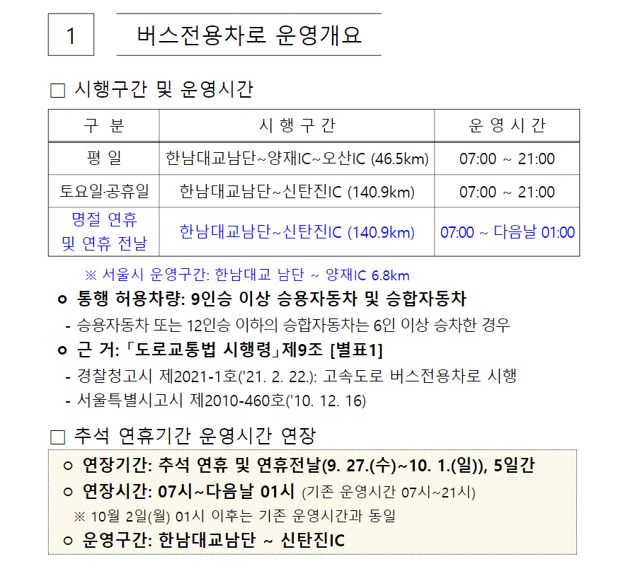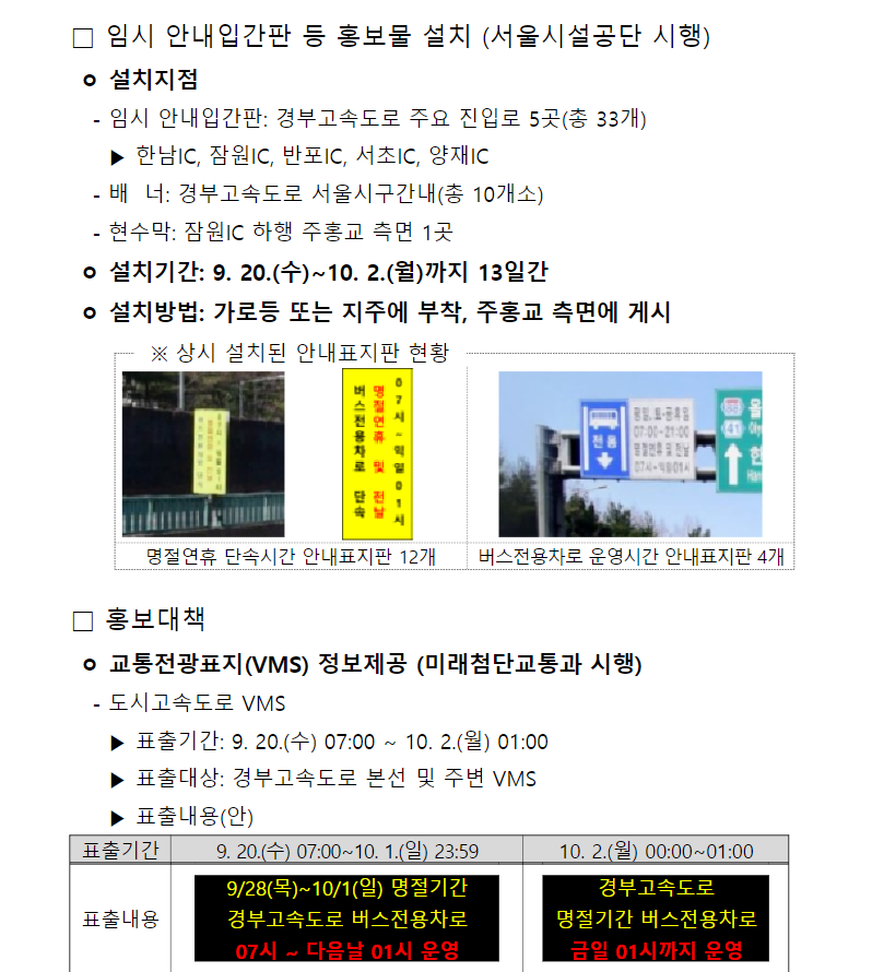 ▶ 2023년 추석 연휴 기간 동안 국내 고속도로의 교통상황은 매우 혼잡할 것으로 예상됩니다. 추석 연휴는 국민 대다수가 공휴일을 즐기기 때문에 교통량이 급증하게 되며, 이로 인해 고속도로에서는 차선 변경, 체인 교체, 정체 구간 등으로 인한 교통체증과 유료소 밀집 등 의 문제가 발생할 가능성이 큽니다. 또한, 최근에는 외국인 관광객들도 많이 늘어나면서 고속도로 교통량이 더욱 높아지고 있습니다. 따라서, 추석 연휴 기간 중에는 가급적 자동차를 이용하지 않고 대중교통 수단을 사용하는 것이 좋을 듯 합니다. 아래는 2023년 추석기간 버스전용차로 운행시간 및 기간이니 참고하시기 바랍니다.