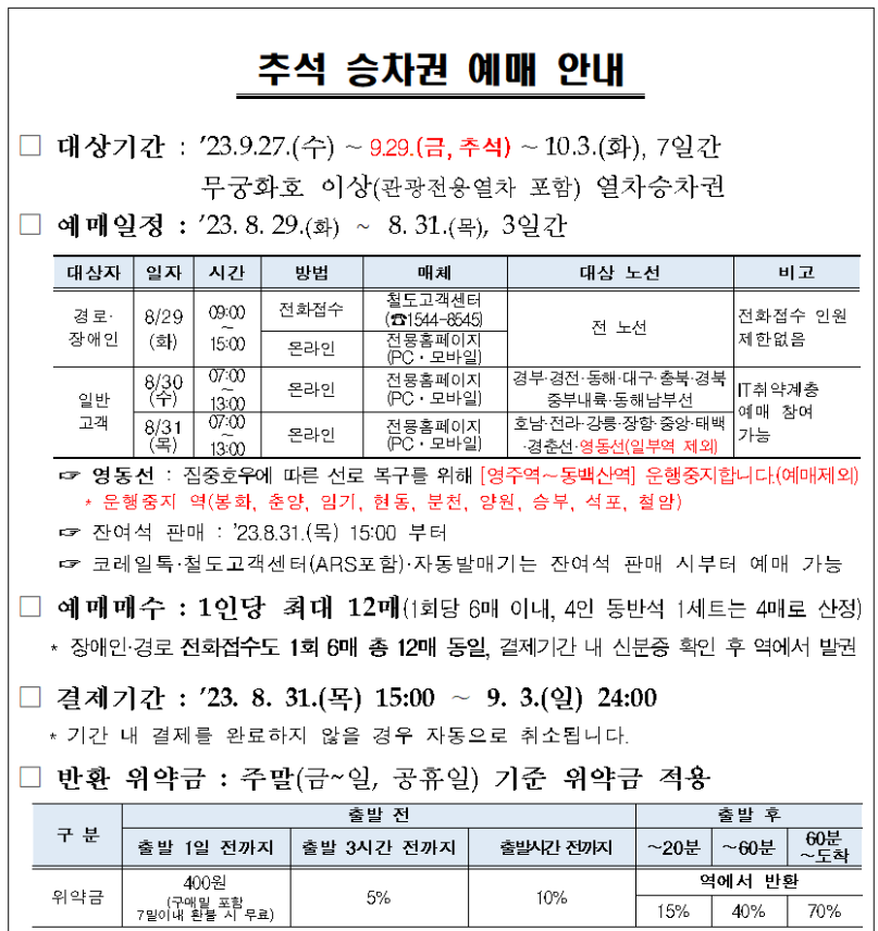 - 2023년 9월 5일 ~ 7일까지 추석 명절 승차권 예매를 100% 온라인으로 운영한다고 밝혔습니다.